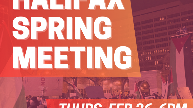 Join the Spring Socialist Network’s Kjipuktuk/Halifax branch organizing meeting on Thursday, February 26th at 6pm, happening at Bus Stop Theatre Co-op (2203 Gottingen St)! The meeting will take place in the Community Room (access via the entrance on Maitland St).