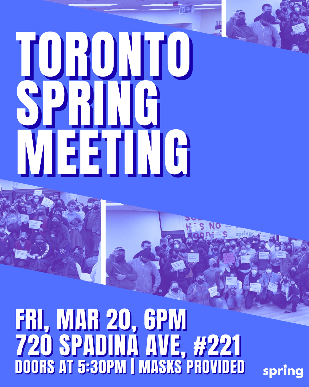 Join Spring’s Vancouver branch organizing meeting on Sunday, March 1, 10:30am PST happening online on Zoom! Whether you’re a Spring member or just someone interested in discussing how...