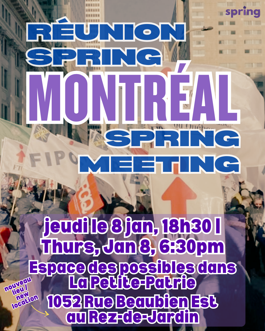 *La version française suit.* Are you a socialist in the Montréal area looking to get organized? Spring is organizing our first ever meeting in Montréal/Tiohtià:ke!...