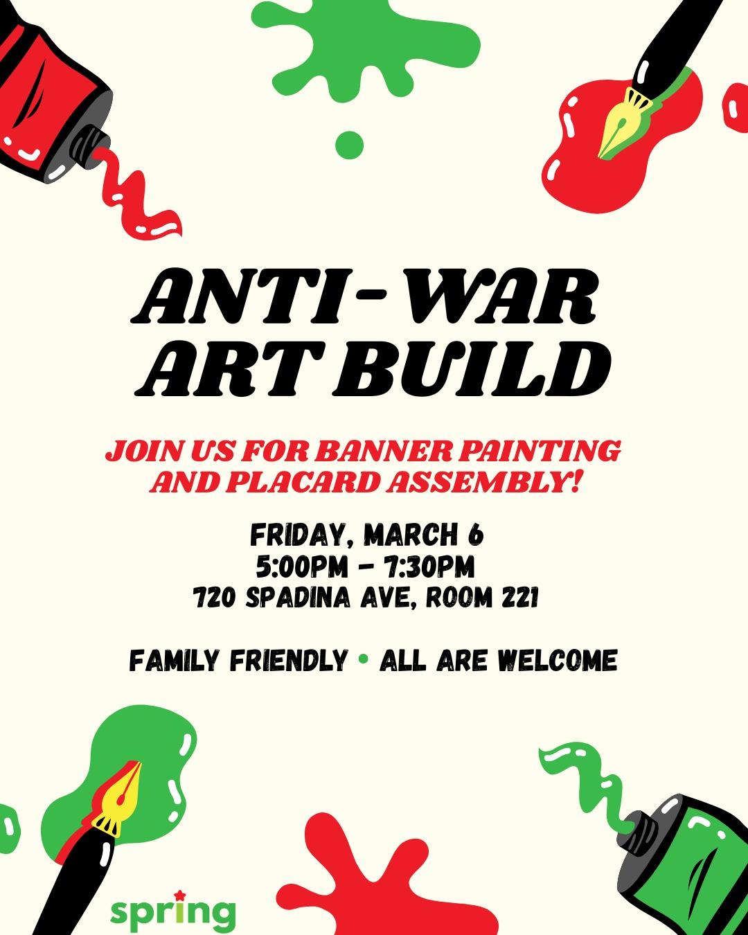 Join Spring's Toronto chapter this Friday at 5:00 pm at 720 Spadina Ave, Room 221, to make anti-war signs and paint banners for International Women's...
